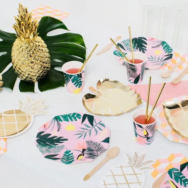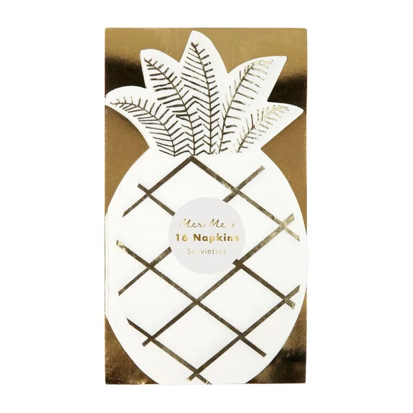 Beeindrucken Sie Ihre Gäste mit diesen fruchtigen Servietten. Kunstvoll in Form einer Ananas geschnitten und mit prächtiger Goldfolie verziert. Gestanzt Goldfoliendetail Packung mit 16 Gefaltete Abmessungen: 98 x 181 mm