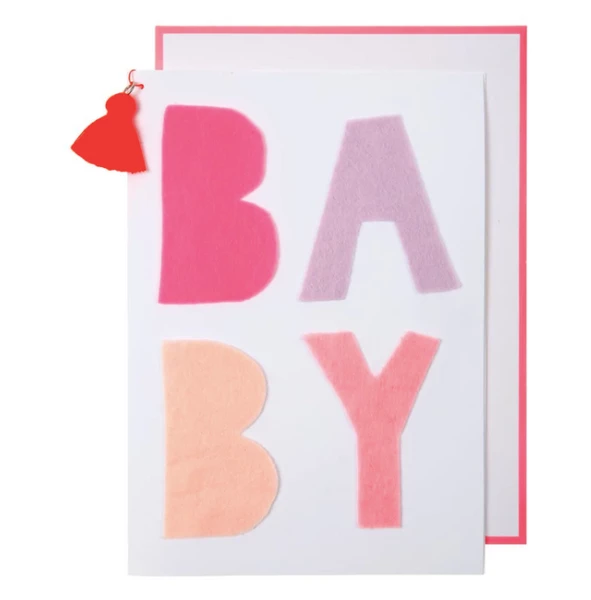 This bright and beautiful card is perfect to send love and congratulations to the new parents. Features a bold motif with the word ‘Baby’ crafted from coloured felt. Elegantly finished with a sweet little tassel. Comes with a coordinating envelope. Felt with tassel detail White envelope with neon edge Inside Message: Congratulations Product dimensions: 127 x 178mm SKU