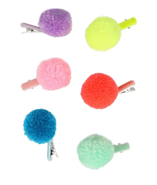 The pompoms are carefully matched with gorgeous velvet covered coordinating fastened onto silver crocodile hair clips. Sold in multiples of 6 The pompoms are crafted from twisted yarn in jade, pink, yellow, neon yellow, strawberry, lilac, and mint.