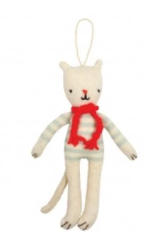A stylish knitted kitty with beautiful red colored scarf and finely stitched details. This gorgeous little cat, would look lovely hanging on a door knob in a childs bedroom.