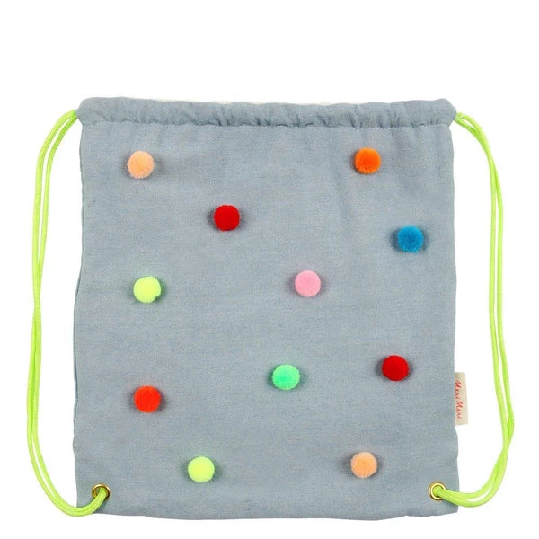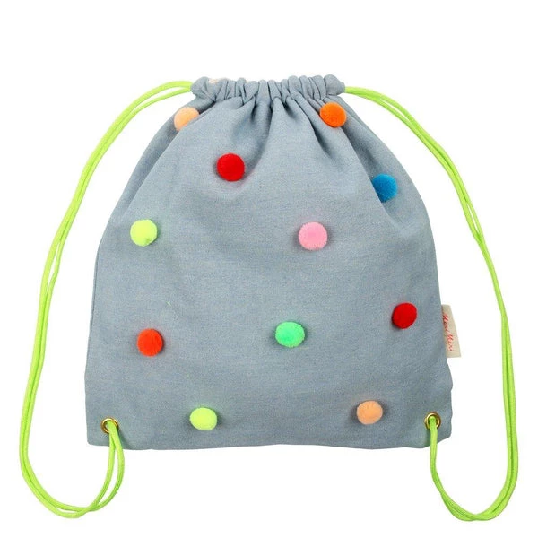 This cute backpack is crafted in chambray denim and decorated with lots of brightly colored pompoms. Bright neon cord arm straps are attached with brass eyelets. It has a handy drawstring fastener and a cotton canvas inner lining. Lined chambray Neon drawstring handles Pompom detail Product dimensions: 305 x 368 x 51mm SKU: 170749