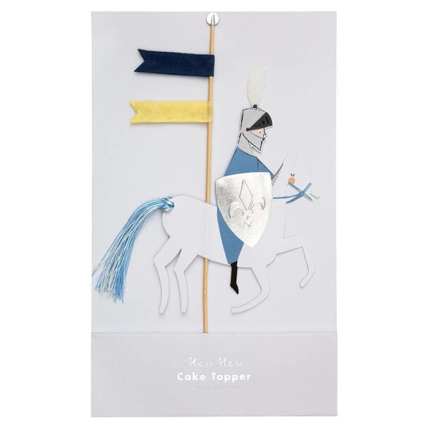 This beautifully designed topper will make the cake the centerpiece of the party! Featuring a dashing knight with a feather in his helmet, a shiny shield, and embellished flags. His handsome steed has thread reins and a gorgeous tasseled tail. Tassel tailNeon print & silver foil detailPack dimensions: 229mm x 279mm x 3mm SKU: 187297