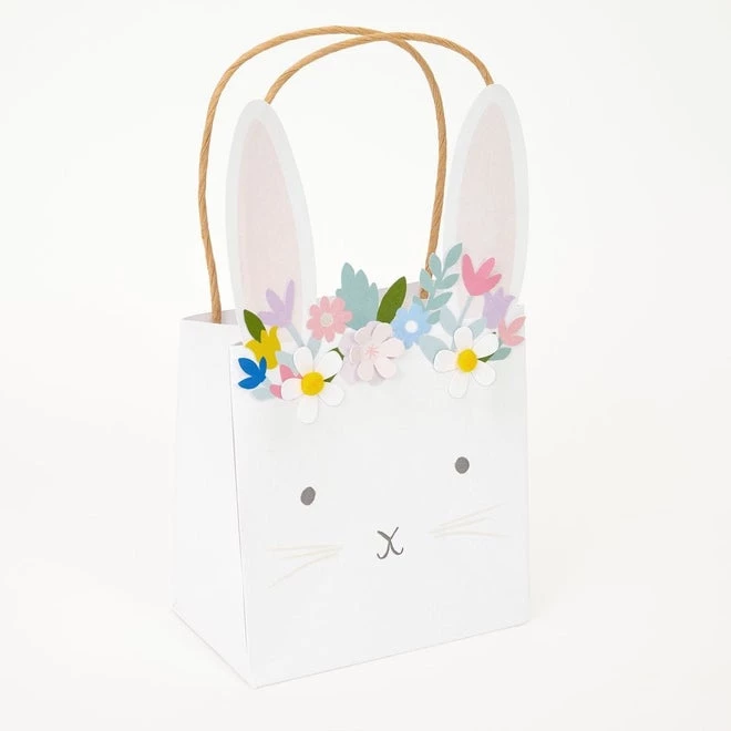 These wonderful Easter bunny bags from Meri Meri feature a floral and foliage cut out design, and are embellished with 3-D flowers with pompom centres. They are perfect to use to collect Easter eggs, or as a party bag to take treats and gifts home. Details: – They are crafted in the shape of a bunny head, with sweet features, pink ears and floral and foliage details – Beautifully embellished with 3 x 3-D flowers, 2 white and 1 pink, with dark yellow pompom centres – The twisted Kraft paper handles are both practical and delightful – Made from eco-friendly paper – Comes in a pack of 6 Product dimensions: 127 x 152 x 76mm