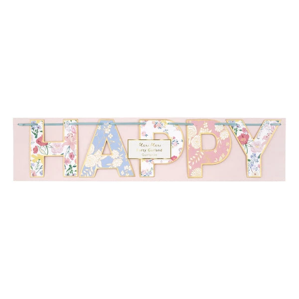 Our English Garden Birthday garland is a really beautiful way to spread the birthday message. Featuring the words “Happy Birthday” spelled out in fabulous floral letter pennants, pre-strung on mint ribbon. A really lovely decoration for a birthday party. 13 floral letter pennants Pre-strung in mint ribbon Gold foil detail Made from eco-friendly paper Product length: 183 cm SKU: 205579