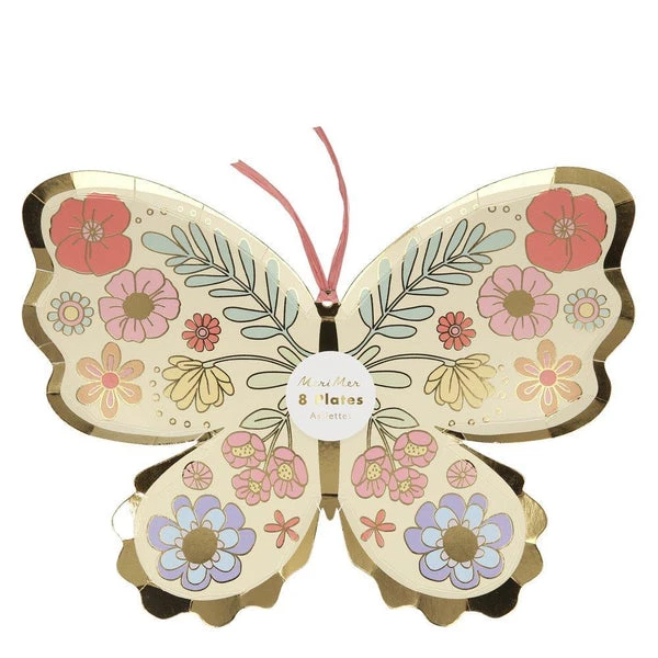 These Floral Butterfly plates are really beautiful! Perfect for a magical princess party, tea party or anniversary. Elegantly illustrated and crafted, with lots of gorgeous gold foil detail and coral raffia antenna. Die cut Coral raffia antenna Neon print & gold foil detail Made from eco-friendly paper Pack of 8 Product dimensions: 26 x 20.3 cm SKU: 206029