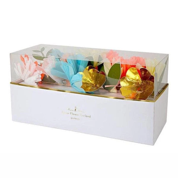 It features 50 assorted flower & leaf pennants It is pre-strung on gold braided string Product dimensions: Garland length – 1.2m Measures 2.2m including excess cord Want to add floral extravagance to your home or to a party? This gorgeous flower bouquet garland features fifty beautifully crafted crepe paper flowers and leaves embellished with shiny gold foil. It’ll give a touch of springtime whatever the weather.