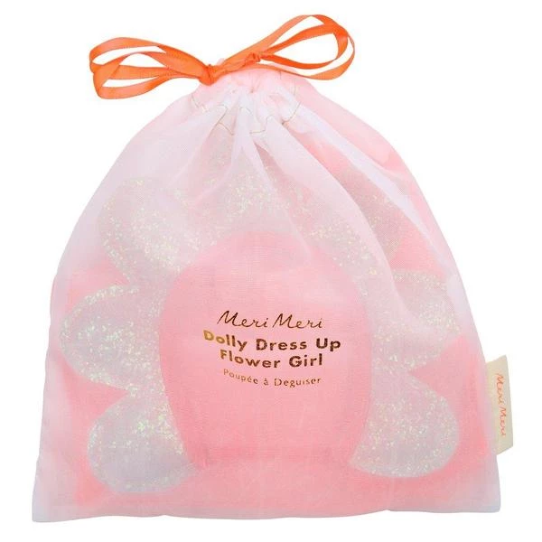 Meri Meri: Flower dolly dress up. Playing dress-up with dolls is a fantastic way to let your little one’s imagination run wild. This flower doll dress-up kit features a beautiful empire line dress and floral headdress. It comes packaged in an organdie drawstring bag. Coral net outfit with flower headdress Coral glitter fabric & elastic detail Drawstring bag Suitable for ages 3+ Pack dimensions: 210 x 330 x 51mm