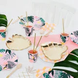 Verleihen Sie Ihrer Sommerparty einen Spritzer Glanz und Glamour und eine gesunde Dosis sonniges Klima mit unserer farbenfrohen und wunderschönen Tropical-Partykollektion! Diese stilvollen Partyteller in Form von Palmblättern und mit Goldfolie verziert – denken Sie an St. Tropez – perfekt für einen Hauch exotischer Schönheit! Gestanzte Goldfolie Packung mit 8 Produktabmessungen: 191 x 225 mm