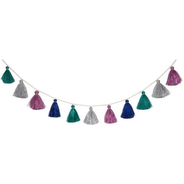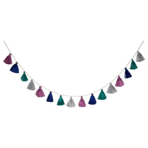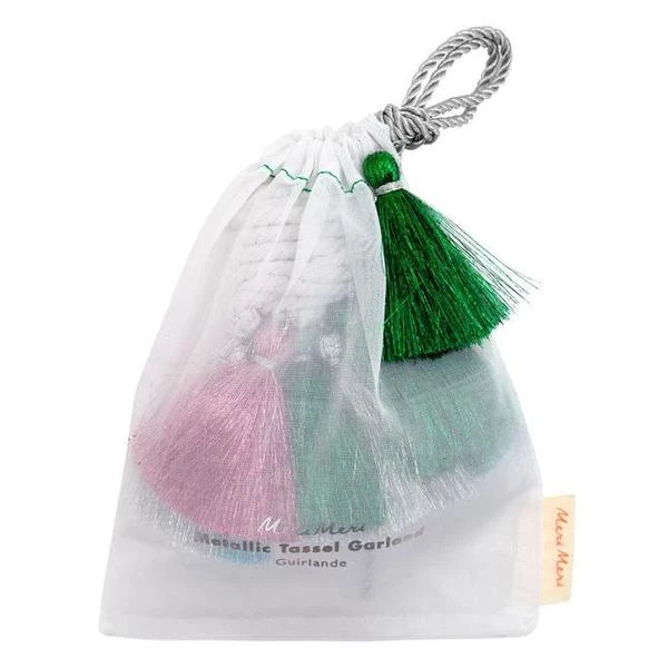 Esta guirnalda de borlas metálicas, en cuatro colores brillantes, agregará un brillo brillante a cualquier habitación. Perfecto para Navidad, Nochevieja o cualquier fiesta especial en cualquier época del año. 16 borlas de hilo metálico en 4 colores Pre-ensartado en cordón natural Bolsa con cordón Longitud del producto unos 3 metros (9,75 pies) Meri Meri es una marca americana, exclusiva de artículos de fiesta y decoración, cuyos productos destacan por su delicada elaboración (gran parte de sus productos están hechos a mano), originalidad en sus creaciones y calidad de sus materiales.