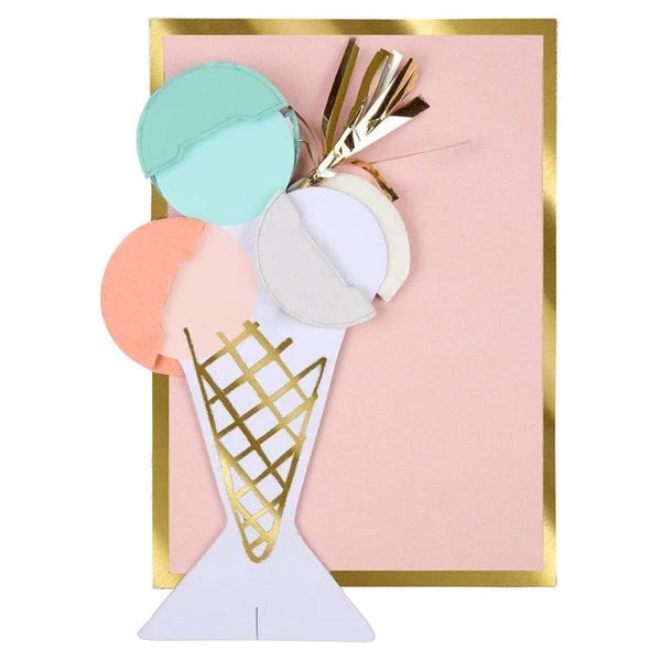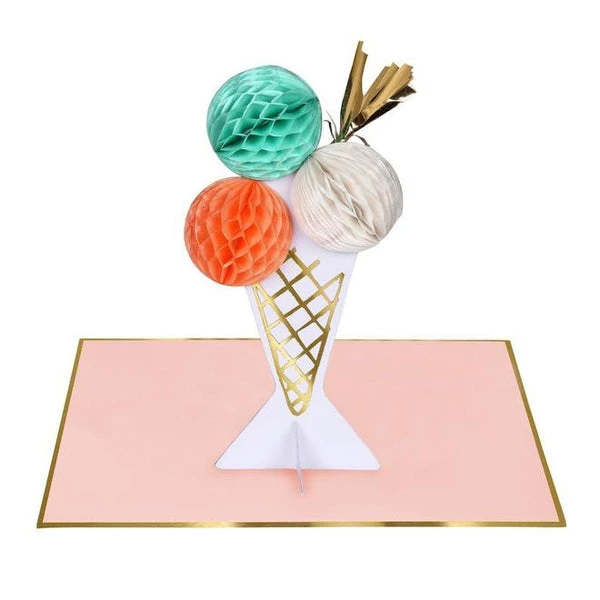 Give a friend a birthday treat with this delightful ice cream card. Beautifully crafted with colored honeycomb paper, gold strips and shiny gold foil embellishments. Comes with a coordinating envelope. Honeycomb with gold tassel Gold foil detail Pink envelope with gold foil edge Inside Message: Happy Birthday Product dimensions: 7 x 5 inches SKU: 173161