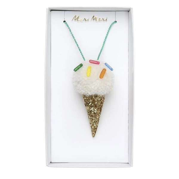 Looking for stylish statement jewelry? This pompom ice cream necklace is glittery and gorgeous. Yarn pompoms with gold glitter fabric Pastel sequin detail Green enamel bead chain Pack dimensions: 3.125 x 6 x 1.25 inches