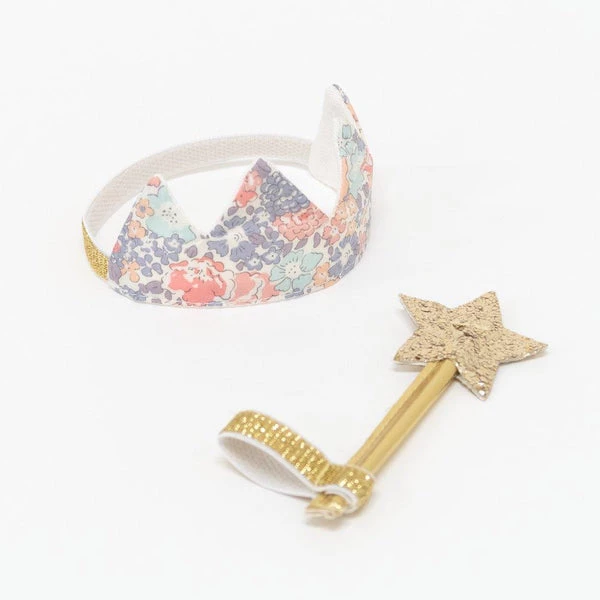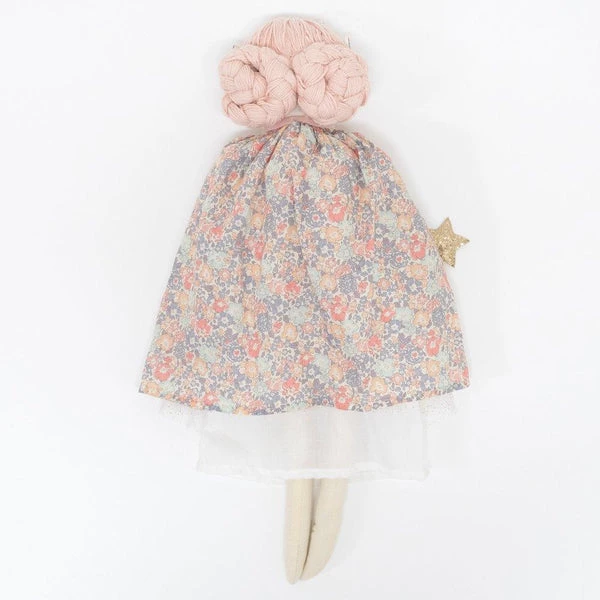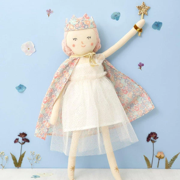 This beautiful Imogen Princess Doll is a truly gorgeous gift. She is wearing a pretty gown, with a Liberty floral print cape and crown. She comes with a gold sparkly magic wand for casting good spells. Cotton with polyester filling Stitched features with pink yarn hair Dressed in white tulle dress with floral cape Floral crown & star wand accessories Made with Liberty Fabric Suitable for ages 3+ Product dimensions: 181 x 470 x 76mm SKU: 201777