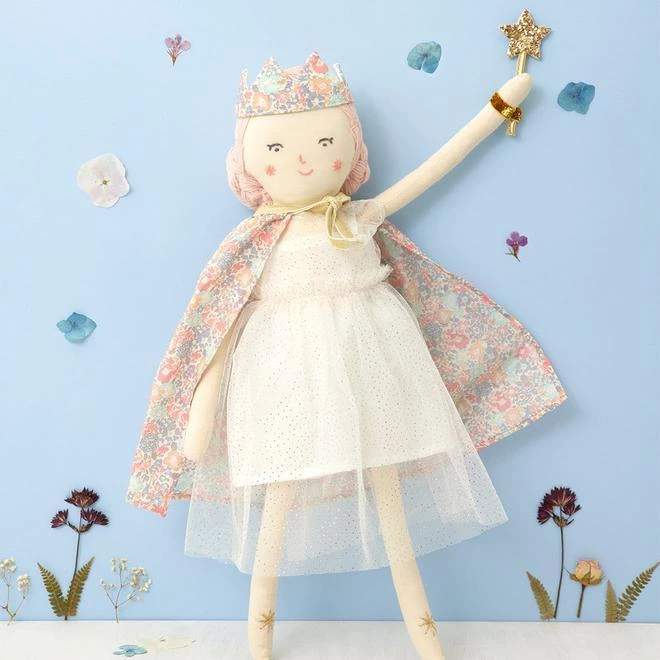 This beautiful Imogen Princess Doll is a truly gorgeous gift. She is wearing a pretty gown, with a Liberty floral print cape and crown. She comes with a gold sparkly magic wand for casting good spells. Details: Cotton with polyester filling Stitched features with pink yarn hair Dressed in a white tulle dress with floral cape Floral crown & star wand accessories Made with Liberty Fabric Recommended age: 3+ Product dimensions: 181 x 470 x 76mm