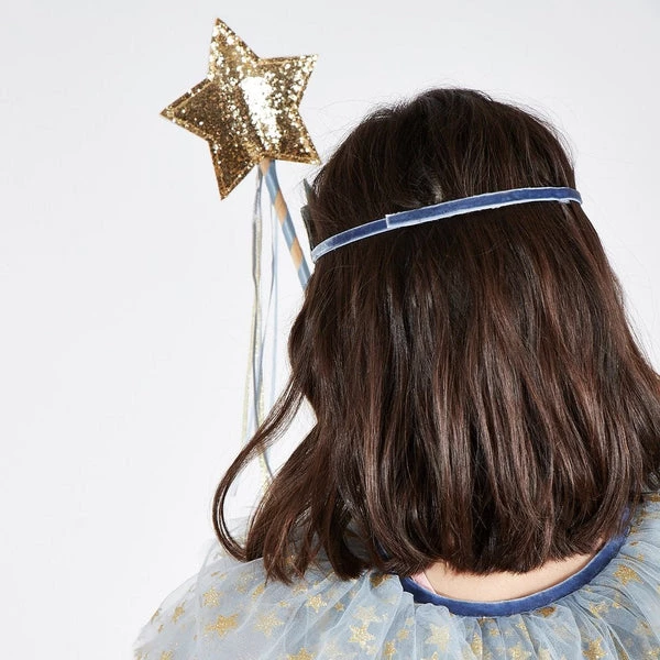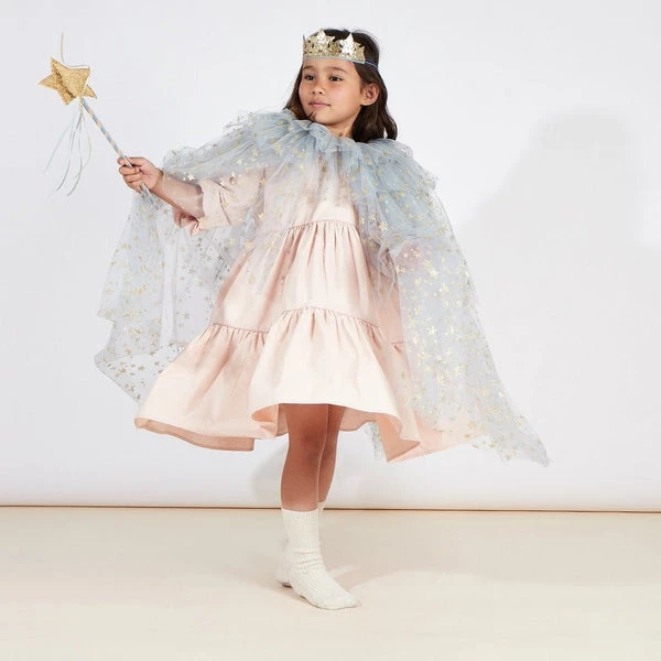 Let your kids shine like a star in this sensational costume. It’s perfect for parties, plays, or dress up at home. It features a tulle cape, a star crown and a star wand. A wonderful gift for hours of imaginative play. The cape is crafted from layers of pale blue tulle, with gold glitter star detail, a blue velvet trim and and closes with a press stud The crown has a blue velvet headband, and gold glitter fabric stars backed with felt The wand is adorned with blue and gold ribbons, and topped with a gold glitter fabric star Suitable for ages 3-6 years Product dimensions:Neck – 457mm, Length – 711mm SKU: 217108