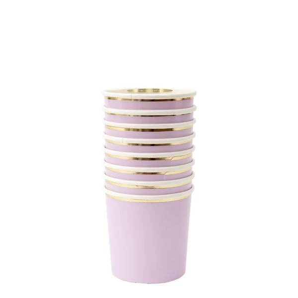 Meri Meri: Lilac tumbler cups. Guests will love their drinks served in these pretty lilac tumbler cups. Made from high-quality card with a shiny gold foil border and superb gloss finish, suitable for hot or cold drinks. Suitable for hot & cold drinks Gold foil detail Pack of 8 Product capacity: 256ml
