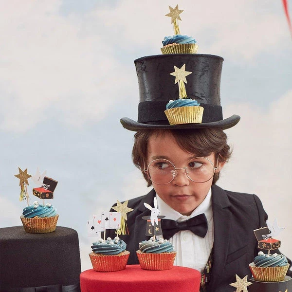 Make your cupcakes look magical with this amazing cupcake kit. It includes 24 toppers in 4 designs, featuring gold glittering stars, cards, rabbits popping out of a hat and doves. It also has 24 cases crafted from gold foil. The kit is presented in a special magic show box, with a gold cord handle – and makes a fantastic gift! The kit features gold foil detail for a stylish effect The 24 toppers includes 6 x 4 designs, with a glittering star with tail, cards, rabbits popping out of a hat and doves The 24 cupcakes cases are crafted from gold foil The kit is presented in a special box, with a gold rope handle Packaging made using eco-friendly paper Pack of 24 in 4 designs Case dimensions: 114 x 32 x 114mm SKU: 215335