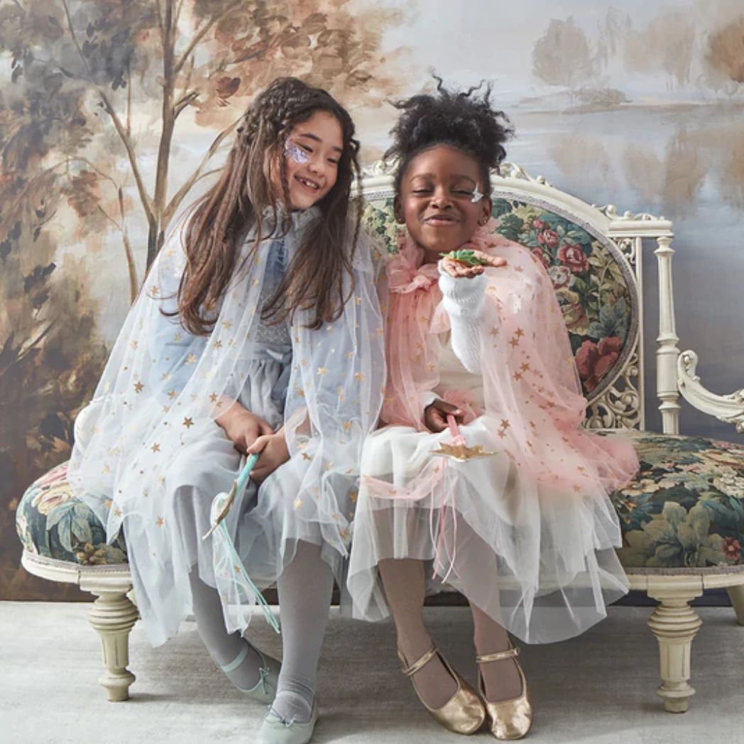 This wonderful pink tulle cape from Meri Meri will look amazing for princess parties or imaginative play. It is crafted from soft tulle with gorgeous gold glitter stars for a sparkling effect. Details Pink tulle cape with gold glitter stars Pink ribbon detail Snap fastener Dimensions Neck: 46cm Length: 65cm Suitable for ages 3-6 years.