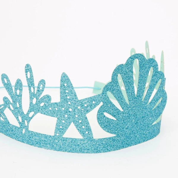 Party guests will love to transform into mermaid princesses with these beautiful crowns. They are crafted with lots of shimmering eco-friendly blue glitter for a dazzling effect. They are ideal for a mermaid or under-the-sea party. The crowns feature delightful designs of starfish, shells and sea plants They have blue elastic to safely secure them when worn Suitable for ages 3+ Made from eco-friendly paper Eco-friendly glitter Pack of 8 Box dimensions: 92 x 64 x 92mm SKU: 215938