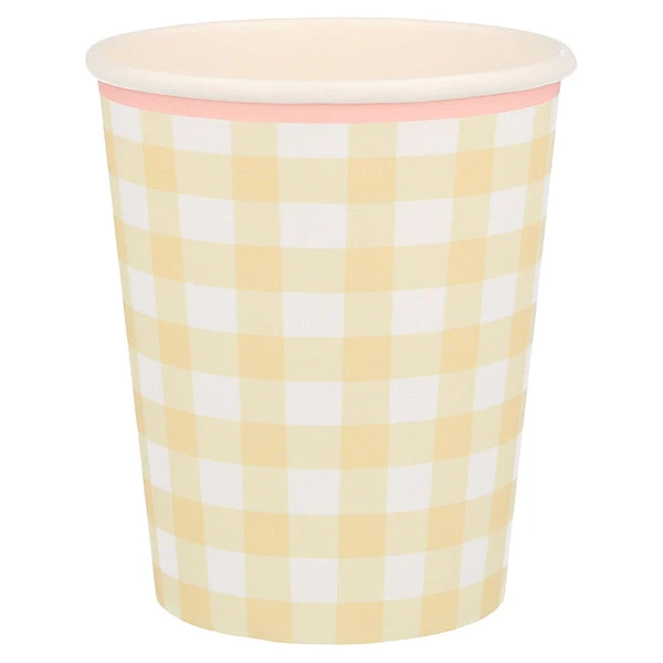 Gingham is a gorgeous print for springtime. It looks wonderful on these cups, which are perfect for serving refreshing drinks in for parties or picnics. They have a border in a coordinating colour for a really stylish effect. The pack contains 12 check-patterned tumbler-shaped cups in a range of colours for your guests to choose from – they’ll look delightful stacked on the party drinks table for everyone to help themselves, or equally as stylish laid out in a place setting. These cups come in 3 x 4 colours of gingham print – blue, coral, pink and yellow The borders have a coordinating colour They are suitable for hot or cold drinks Made from eco-friendly paper Pack of 12 in 4 colours Product capacity: 256ml Pack dimensions: 76 x 184 x 76mm
