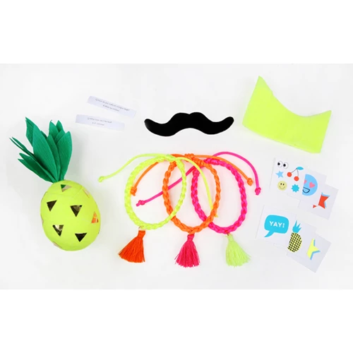 Each contains 2 temporary tattoos, 1 joke, 1 hat & either 1 friendship bracelet or 1 mustache.