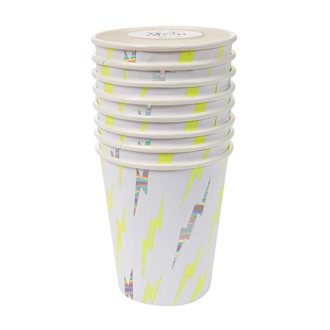 It’s thirsty work being a superhero, so drinks served in these seriously cool party cups will be much appreciated. Decorated with zap patterns embellished with shiny silver foil.