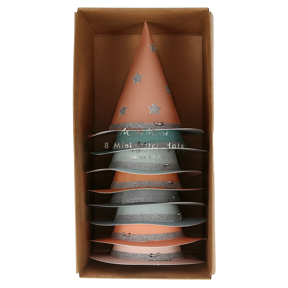 These mini witch hats make the perfect Halloween accessory great to wear at a party and when trick and treating too. They are beautifully crafted from paper, with plant based eco silver glitter detail. The pack includes 8 hats, each in a different color. Eco silver glitter detail, in the shape of stars and a border around each hat, adds a sensational effect. Each hat has a piece of elastic threaded through the holes, and knotted, for comfortable wear. They are presented in a stylish box with silver foil detail. Pack of 8 hats in 8 colors.