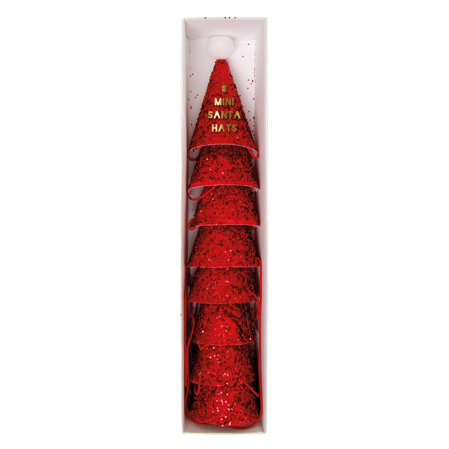 Covered with red and white crepe paper, and topped with plant based Eco silver glitter star stickers. They are tied with shiny silver foil. Each contains a red, silver or pink party hat, a self-adhesive moustache, 2 festive stickers, and a red and white friendship bracelet.