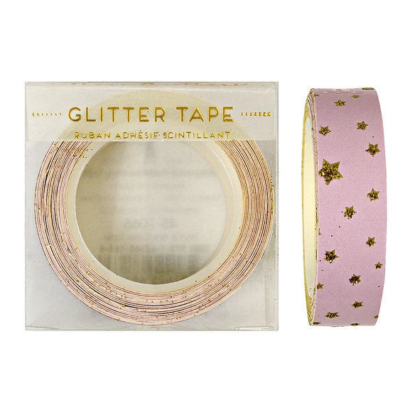 Finish your gift in style with this beautiful glitter tape in pink with shimmering gold star patterns. It is embellished with gold glitter and foil Pack contains 1 roll of self-adhesive glitter tape. Tape length: 3 yards