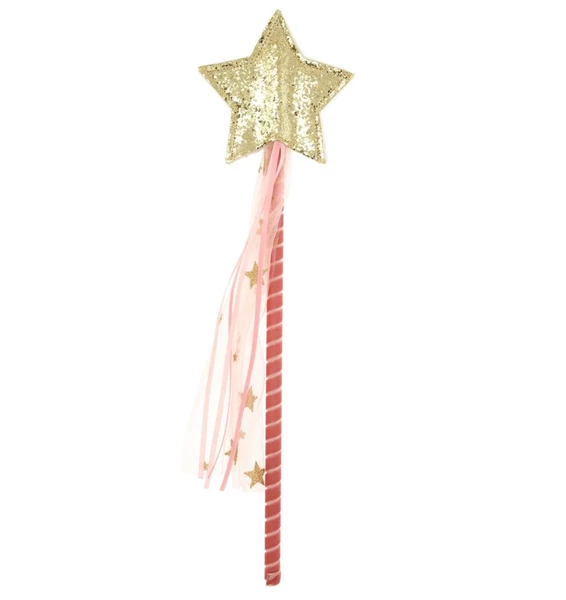 A magical wand is an essential accessory to have in a dressing-up box. This one is crafted from sturdy wood, with a gorgeous gold glitter star, pink tulle with gold glitter stars, and pink ribbons. Sturdy wooden wand Gold glitter star Embellished with pink tulle with gold glitter stars, and pink ribbons.