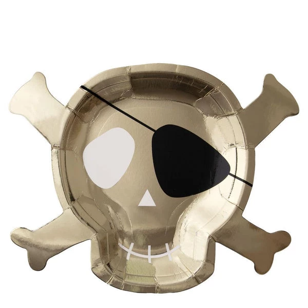 These shiny gold skull and crossbones plates, complete with swashbuckling eyepatches, are just perfect for little pirates to load with party food. Die cut Gold foil detail Pack of 8 Product dimensions: 25.7 x 20.1 SKU: 186613 9