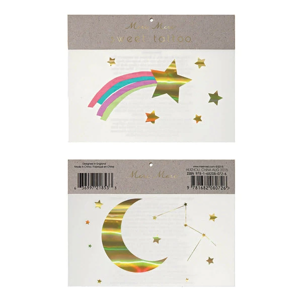 Temporary Holographic gold foil detail Pack of 2 sheets Pack dimensions: 114 x 89 x 3mm Transform your look with these out-of-this-world temporary tattoos! Featuring shiny stars and a moon, all with gorgeous holographic foil detail. Perfect as party favours or a little gift for a star lover.