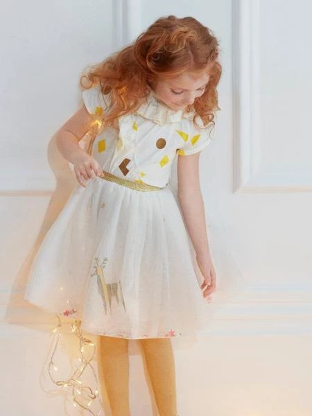 Get your little one in the mood for Christmas with this fabulously festive dress-up kit. It contains a beautiful net skirt embellished with a reindeer decoration and filled with colourful sequins. The headband has pretty net pompoms. Comes in a stylish drawstring bag. Sequin filled lined net skirt with gold elastic waistband Pompom headband with hook & loop fastener Drawstring bag Suitable for ages 3-6 years Product dimensions: Waist – 495mm, Length – 362mm SKU: 179713