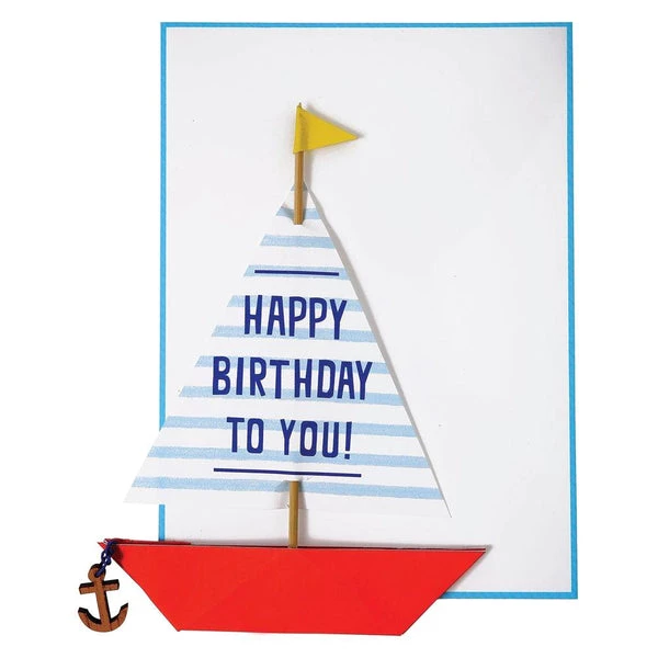 Wood & chain detail White envelope with blue edge No inside message Product dimensions: 178 x 127mm This sensational sailing boat card is beautifully decorated in bright colours with a birthday message on the sail. It also has a sweet little wooden anchor and chain. Comes with a coordinating envelope with printed border.