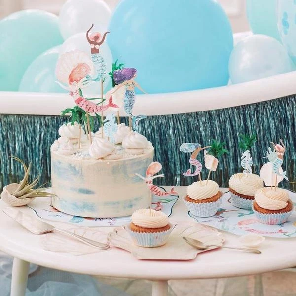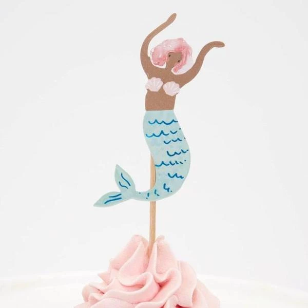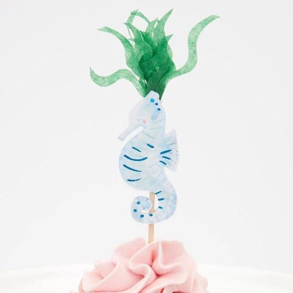 Meri Meri: Mermaid cupcake kit (set of 24 toppers). Make your cupcakes a highlight of your party with this fantastic mermaid cupcake kit. It includes 24 toppers, with 6 designs including beautiful mermaids, a seahorse and seaweed. The 24 cupcake cases feature 2 charming coordinating designs. The kit is presented in a special box, which makes a delightful gift. The 24 toppers, 4 x 6 designs, have lots of shiny blue and pink foil, and the seaweed topper is crafted from tissue paper The 24 cupcake cases have 2 pretty coordinating designs Packaging made using eco-friendly paper Pack of 24 in 6 designs Case dimensions: 64 x 32 x 64mm