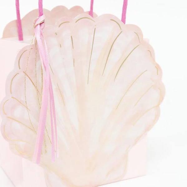 After an undersea party complete with mermaids give your little guests their goodies in these cute shell party bags. Each bag is embellished with shiny silver foil and ribbon tassels. They are finished with coral red, twisted paper handles. Pack contains 8 party bags. Bag size: 6.5 x 6.5 x 3 inches. New Part Number: 156259