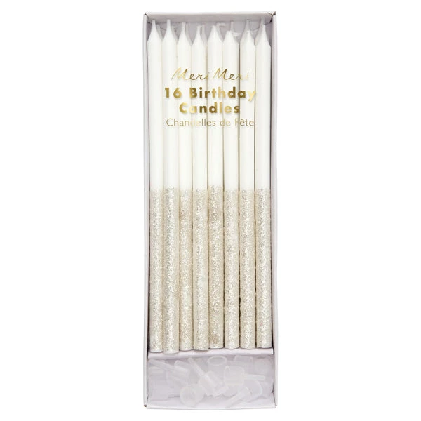 These gorgeous two-tone glittery candles will look really impressive on a special celebration cake. Pack of 16 candles Plastic holders Silver glitter detail Candle height: 146mm Pack dimensions: 57 x 171 x 19mm 187036