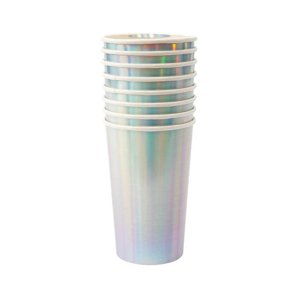 Stylish and shiny, these silver holographic highball cups are a spectacular way to serve long refreshing drinks to your guests. Made from high-quality card with a superb gloss finish, suitable for hot or cold drinks. Pack of 8 cups Silver holographic foil detail Suitable for hot & cold drinks Capacity: 369ml