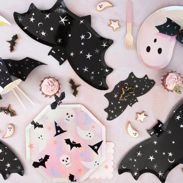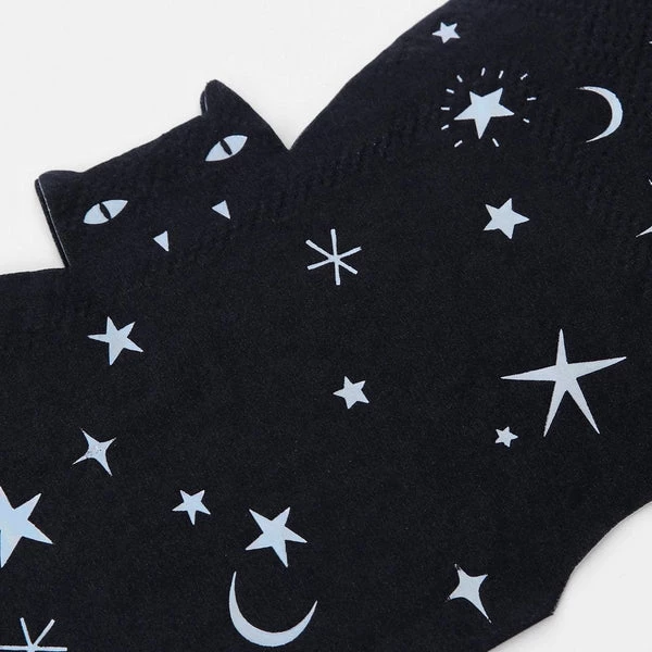 These shimmering bat napkins, with lots of silver holographic foil detail, will look amazingly eerie on your Halloween party table. Guaranteed to frightfully delight your party guests! Die cut Silver holographic foil detail Made from eco-friendly paper Pack of 16 Folded dimensions: 203 x 92mm SKU: 208549