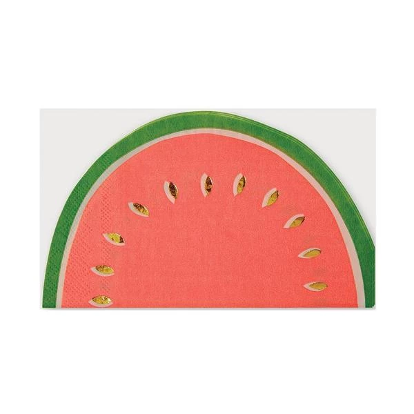 Pack of 16 Size folded 165mm x 195mm Bringing a super summer vibe to the table these watermelon napkins from Mer Meri will delight everyone. Brightly coloured and finished with a foil detail.